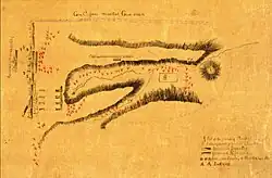 Construction on the protective stockade began in the fall of 1813.[9] Friendly Creeks from Chinnabee's town and Talladega assisted in the fort's construction.[10][11] The fort was likely square or rectangular and consisted of upright, quartered cedar logs.[4] A contemporary map drawn after the Battle of Talladega (included on the right side of the article) depicts Fort Leslie's stockade as being formed in a circle. A platform was built around the inside of the palisade so the fort's occupants could fire over the walls.[2] The fort's occupants obtained water from a nearby spring known as Big Springs.[12][13]