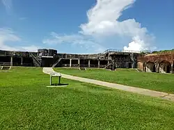 During the Battle of Mobile Bay on 5 August 1864, United States Navy forces under Admiral David G. Farragut[7] passed Fort Morgan and entered Mobile Bay. Farragut captured the Tennessee and the Selma, forced the beaching and burning of Gaines, and captured Fort Gaines. This freed U.S. Army units under U.S. Major General Gordon Granger to besiege Fort Morgan.[7] After two weeks of bombardment from sea and land, Richard Lucian Page, commander of the fort, surrendered on 23 August 1864,[7] after first spiking the fort's guns. During the siege, the wooden roof of the fort's citadel, a ten-sided barracks located in the center of the fort used to house the enlisted men, caught fire and the structure was badly damaged.[7] Rather than restore it, post-war crews used the ruins as a brick source for repairing the fort. The remains of the citadel were razed in the 1880s for use as a breakwater.[8]