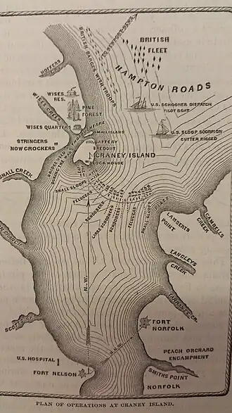 Although private property at the time, the site of Fort Norfolk was first fortified by citizens of Norfolk during the American Revolutionary War in order provide harbor defense.[5] The fort is located at a point where the Elizabeth River narrows and was used in conjunction with Fort Nelson on the opposite bank of the river in Portsmouth. This was done with the aim of providing a crossfire on any ships attempting to bombard and/or conduct an amphibious assault on Norfolk, Portsmouth, or the Gosport Navy Yard. Ultimately this failed as these positions were too weak to prevent a naval bombardment on Norfolk, later known as the Burning of Norfolk, by Lord Dunmore on January 1, 1776. At the time, Norfolk had been largely abandoned by its mostly pro-British Tory population. Patriot Whig forces made some effort to repel British landing parties, but did nothing to put out the fires and looted abandoned Tory properties.[7]