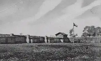 Fort Parker was established about two miles (3.2 km) north of present-day Groesbeck, Limestone County, Texas, United States, by John Parker, his sons, Benjamin, Silas and James, with other members of the Pilgrim Predestinarian Baptist Church of Crawford County, Illinois.[2][3][4] Led by John and Daniel Parker, they came to Texas in 1833.[5][3][4] Daniel's party first settled in Grimes County, then later moved to Anderson County near present-day Elkhart and established Pilgrim Church. Elder John Parker's group settled near the headwaters of the Navasota River, and built a fort for protection against Native Americans. It was completed in March 1834. Fort Parker's 12-foot-high (3.7 m) log walls enclosed four acres (16,000 m2). Blockhouses were placed on two corners for lookouts, and six cabins were attached to the inside walls. The fort had two entrances, a large double gate facing south, and a small gate for easy access to the spring.[6][3] Most of the residents of the fort were part of the extended family of John and Sarah Parker.