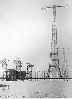 In 1923, the fort was adopted to house the broadcasting infrastructure of the Transatlantic Radiotelegraph Exchange, at the time, one of the largest radio communication stations in the world. The complex included ten 127-metre-tall (416.7 ft) steel radio masts, placed in the nearby Bemowo Woods, in an area spaning 4 km (2.5 miles). They were operated with the 200 kW Alexanderson alternators powered by a 500 kW Diesel engine, providing stable connections and large range, which allowed for worldwide communications, conducted with the Morse code. In 1926, the complex was connected to the power plant in Pruszków, and in 1938, two more radio masts were added. The Transatlantic Radiotelegraph Exchange also had its receiver infrastructure in Grodzisk Mazowiecki, and the Central Operations Office in Warsaw.[1][2]