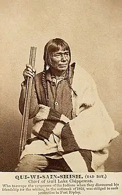 Despite an undercurrent of mistrust, relations between settlers and Chippewa was mainly peaceful in northern Minnesota. That nearly changed when the Santee Sioux hostilities broke out. According to the media Chief Hole in the Day of the Gull Lake Band considered the Sioux conflict as an opportunity to gain leverage for redress of grievances by threatened to launch a simultaneous war in northern Minnesota. The rumors caused fearful settlers to flock to Fort Ripley for security.[2] Not all of Hole-In-the Day's Gull Lake band were in agreement with him. Chief Qui-We-Sain-Shish (Bad Boy) went to Fort Ripley on his own.[20] Company's from both the 6th and 7th Minnesota were rushed to the post. Word reached the Mille Lacs Band reservation that Chief Hole-in-the-Day was considering attacking the fort. Head civil Chief Shaw-Bosh-Kung of the Mille Lacs Band of Ojibwe organized his band and lead 700-750 warriors to Fort Ripley to defend the fort and to volunteer to fight the Sioux.[21] According to the record they presented a sight waving flags and beating drums.[21] Later the 27th Iowa recorded that the Mille Lacs had a U.S. flag and one that they had made with and eagle and stars.[22] The Indian commissioner Dole met with them and told them to return to the reservation and they would be contacted if their assistance was needed.[21] Dole also gave the Mille Lacs a document in appreciation of the Mille Lacs offer stating that they could stay on their reservation for a 1000 years.[21] War Chief Mou-zoo-mau-nee and 300 warriors remained at Ripley to augment in its defense, 200 from the Mille Lacs band along with 100 from the Sandy Lake and Snake River and Chippewa River Bands. According to Chief Mou-zoo-mau-nee's obituary the people of Little Falls asked for protection. The town was 15 miles downriver from the fort. He sent 150 warriors.[23] The town's woman prepared a welcome meal and the men smoked the peace pipe with the warriors. Shortly after the executions in Makato the Chippewa leaders were summoned to Washington where Lincoln repeated that the Milles Lacs could remain on their reservation for a 1000 years.[21]: 116 It was also written into the treaty they signed in Article 12. The Chippewa signed another treaty in 1864 where it is reiterated with the addition that the Sandy Lake band could not be moved without Presidential approval. The State erected a large monument to the Chief and the Mille Lacs band at Fort Ridgely in 1914.[24] In recognition for their service to the State the participating bands were designated as "non-removable". On September 2 two Chiefs of the Fond du Lac band were the first to send Lincoln an offer to fight the Sioux.