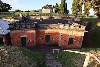 In 1899, an underground steam engine room and two searchlights were added.[2][3] One searchlight was in the tunnel on the right of the courtyard and the other to the west accessed from a tunnel at the back of the engine room.[1] The searchlights were used until the end of World War II.[3]