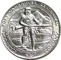 The obverse features a portrait of McLoughlin, facing left. The name of his adopted country overarches him, and his name and 'HALF DOLLAR' are below him, with the centennial dates and 'IN GOD WE TRUST' flanking his bust.[4] Fraser had no likenesses of McLoughlin to work with, and what she based her portrait of him on is unclear.[18] It shows him as an older man than the 41 years he was at the time of Fort Vancouver's founding.[19] The reverse shows an armed frontiersman, dressed in buckskins, with the stockade of Fort Vancouver behind him, and Mt. Hood in the distance. The inscription is somewhat broken up, but is intended to be read as 'FORT VANCOUVER CENTENNIAL VANCOUVER WASHINGTON FOUNDED 1825 BY HUDSON'S BAY COMPANY'. Numismatists have debated whether the absence of a mint mark was intentional; it is the only commemorative coin issue struck at Denver or San Francisco that lacks one.[19] The artist's initials, 'LGF', are at lower right on the reverse, on the other side of the circle from the date '1825'.[4]