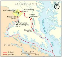 In April, 1814, Napoleon abdicated and was exiled. This freed the British army and navy to focus on the conflict with the United States. In early August, part of a naval squadron under Captain James A. Gordon began ascending the Potomac River from the Chesapeake Bay. The Secretary of War, General John Armstrong, Jr., did not see any military value to Washington. He believed that the British movement toward the Capital was a ruse and insisted that their destination was actually Baltimore, so no effort was made to strengthen the Washington defenses.[9]