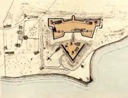 Captain George Bomford was assigned to the work and the plans of Fort Madison at Annapolis were used for the Potomac fort. It was soon discovered that the four acres purchased from Thomas Digges was too small. Colonel Williams directed Captain Bomford to lay out the work again but on a reduced scale. The barracks was shifted to one side and one wing shortened to accommodate the new design.[9] Work commenced on April 14, 1808, and was completed on December 1, 1809. It was anticipated that 120 artillerymen would be assigned to the post as a wartime garrison and gunboats from the Navy Yard would support the fort. Captain Bomford described the fort as "an enclosed work of masonry comprehending a semi elliptical face with a circular flank on the side next to the Potomac." There were also quarters for two companies and a total of 15 cannon. On the bluff above the fort, a masonry tower could house one company and six additional cannons. Later, Captain Bomford reported "Fort Washington was really an attempt to adopt a standardized plan to an unsuitable site. It violated a fundamental rule in the art of fortifications—the fort must suit its site."[9]