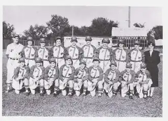 Front, L-R: Jean Geissinger (CF), Rita Briggs (C/OF), Jean Havlish (SS), Alice Blaski (utility), Delores Brumfield (IF), Lavonne Paire (C), Shirley Crites (3B), Wilma Briggs (LF), Dolly Vanderlip (P). Back, L-R: Bill Allington (manager), Maxine Kline (P), Katie Horstman (UT), Jean Weaver (P/3B), Jaynne Bittner (P), Joanne Weaver (RF), Betty Weaver Foss (1B), Mary Taylor (OF), Pat Scott (P), Doris Tetzlaff (chaperone).