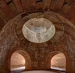The trapezoidal fort is arranged to face to the north, its entry to the south. The pink sandstone walls enclose a court which contains a central block which in turn contained magazines and barracks, as well as two twin 155mm Mougin gun turrets, which constituted the fort's primary armament. It was originally furnished with a variety of guns on the ramparts, which were gradually reduced as the vulnerability of fixed gun emplacements in the open air became apparent. Six casemates were arranged for indirect fire, along with two satellite batteries. An optical signal post permitted communication with the Fort du Salbert to the south.[2]