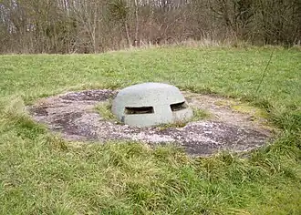 Situated between the north and south batteries 48°39′36″N 5°58′46″E / 48.66000°N 5.97944°E / 48.66000; 5.97944 on the opposite side of the village from the redoubt, the redan is equipped with a 75mm gun turret and two armored observatories. A concreted barracks was added in 1890 under the turret. The redan was overlooked by a water tower and the steeple of the village church, which were dynamited in 1914 to prevent the Germans from using them to sight artillery. The Germans never came close to Villey, and the church tower was rebuilt in 1950. A third observation point was added during the war. In 2002 the preservation association pumped w to 2.5 meters of water from the works, allowing access to the barracks and turret. Limited stabilization work was done, and the area awaits restoration. It is not presently accessible to the public.[7]