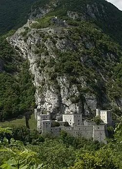 The upper fort (fort supérieure) is 200 metres (660 ft) above the lower fort. Its location allows the upper fort to control the valley, including the railroad viaduct, and to protect the lower fort. It was built between 1834 and 1848. Today, the lower fort and the subterranean steps and casemates cut into the rock above it, up to and including terraces just below the upper fort, are open during the summer months for visiting, however the upper fort is not currently safe for visitors.[5] Furthermore, a moderately difficult (AD)[6] via ferrata exists which takes climbers from the lower fort to the upper fort by traversing the rocky hillside. In addition, there are many hiking trails in the area which allow hikers access to the upper fort.