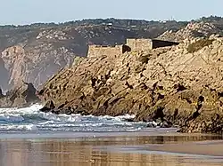 ![]() The rectangular strong-house of Guincho on the edge of the rocky outcroppings of Abano beach | |