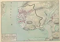 When the Seven Years' War brought conflict with France and Spain, it was decided to protect the dockyard from landward attack by means of a ditch and earthen rampart, known as the Dock Lines or later the Devonport Lines. The total length was about 2,000 yards (1,800 metres) and included four bastions and two gateways, a third gate was added at the end of the century to give access to the Torpoint Ferry. The lines were supported in the rear by a series of defensible barracks, each provided with a rampart and bastions.[11] A survey in 1805 shows 130 guns mounted on the lines and they were completely rebuilt from 1810 to 1816 with a stone faced rampart and a deeper ditch.[12] The lines were progressively abandoned and redeveloped in the second half of the 19th century.[11]