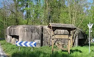 The defense of the area surrounding Strasbourg benefited from the width of the Rhine and its numerous oxbows and dead arms that complicate movement on the French side of the river. As with the sectors further south, three lines of fortifications were built: a line of casemates right on the riverbank, a line of infantry shelters a few hundred metres to the rear, and a line of heavier casemates between two or three kilometres back from the riverbank. No interconnected ouvrages of the type found in sections of the main Maginot Line just to the west were built in the Lower Rhine sector. Strasbourg, directly on the riverside, could not be defended in depth, and so made do with casemates on the riverbank.[1] Strasbourg was effectively considered an open city, as it could otherwise be easily destroyed by German artillery on the other side of the Rhine.[2] However, some of the German festungen from the late 19th century surrounding the city were reactivated from 1935, with blockhouses at Fort Pétain, Fort Ducrot and Fort Foch. Artillery positions were placed at Fort Ullrich, Fort Ducrot and Fort Ney-Rapp. 65mm naval guns were added at six additional positions. No substantial garrison was stationed at any of the old forts, only crews sufficient to serve the arms.[3]