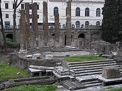 The Temple of Fortuna Huiusce Diei in the Area Sacra was vowed by Q. Lutatius Catulus at the Battle of Vercellae in 101 BC.[5] It is the only known temple to this goddess, and probably the first.[6] Its founding belongs to a period of religious innovation, with new cult titles for traditional Roman deities, and an increasing tendency to embrace imported gods, particularly those of the Greeks, through theological and artistic interpretation.[7] Catulus himself was known as a lover of Greek culture in his taste for art and poetry, and in matters of lifestyle. The architectural design of the temple reflects cultural syncretism: the frontality of its podium design would have placed the focus on the cult statue in the Roman manner, but some aspects are Hellenistic.[8]