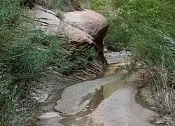 The headwaters of Fortymile and Willow Gulches have their origins along a 7-mile (11 km)[1] segment of the Straight Cliffs, the eastern edge of the Kaiparowits Plateau. Intermittent streams merge to form larger branches, then combine to carve a deep canyon up to 500 feet (150 m) into sandstone layers before meeting the main channel of the Escalante River. The northernmost branch is Fortymile Gulch, the historic location of the winter encampment of the San Juan Expedition. Intent on founding a colony in southeastern Utah, they waited at Fortymile Springs in late 1879 while a smaller group prepared a perilous route down to the Colorado River at Hole-in-the-Rock. Nearby is Dance Hall Rock, a scenic dome formed from Entrada sandstone.[2] The lower section of Fortymile Gulch, before it merges with Willow Gulch, is a narrow channel of slot canyons and water pools.