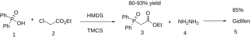 Diphenylphosphinic acid [1707-03-5] (1) is reacted with ethyl chloroacetate (2) in the presence of hexamethyldisilazane and trimethylchlorosilane to give Diphenylphosphinyl acetic acid ethyl ester i.e. ethyl (diphenylphosphoryl)acetate [6361-05-3] (3). Further reaction with hydrazine gives the required Fosenazide (4).