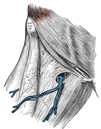 In anatomy, the saphenous opening (saphenous hiatus, also fossa ovalis) is an oval opening in the upper mid part of the fascia lata of the thigh. It lies 3–4 cm below and lateral to the pubic tubercle and is about 3 cm long and 1.5 cm wide.