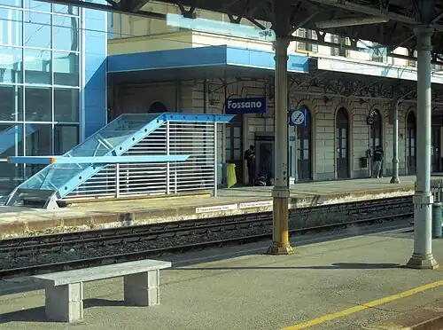 Fossano railway station (Italian: Stazione di Fossano) is the railway station serving the comune of Fossano, in the Piedmont region of northwestern Italy. It is the junction of the Turin–Savona and Fossano–Cuneo railways.