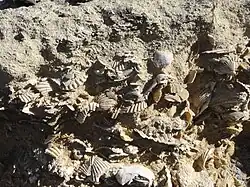 A fossil beach, also known as a paleo-beach, fossil strandline or raised beach,[1] is an ancient oceanic or lacustrine beach preserved in fossil form due to a change in water level or sea level, or because of a shift in terrain elevation.[2] It is often present as a sediment layer or terrace, with beach-related fossils and features, above the present shoreline.[1]