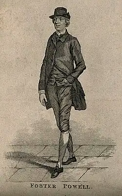 Powell was baptized in Horsforth in 1734, and moved to London in 1762 where he worked as a lawyer's clerk.[1][4] In 1764 he began his pedestrian career by wagering that he could walk 50 miles in 7 hours, which he accomplished on the Bath Road.[5] He became a national celebrity, but made very little money from walking, which he treated as a hobby, and died in relative poverty at the age of 59 on 15 April 1793.[2][4] He was buried at St Faith's Church in St Paul's Cathedral Churchyard, after a walking funeral procession.[4][5]