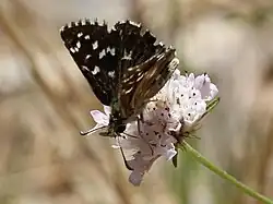 Foulquier's grizzled skipper (Pyrgus bellieri, syn. P. foulquieri) is a species of skipper (family Hesperiidae). It has a limited distribution in central and southern France and adjacent areas of Spain and Italy and also Corsica. Within this range it can be quite common.