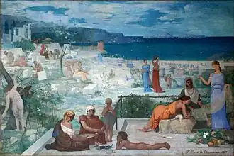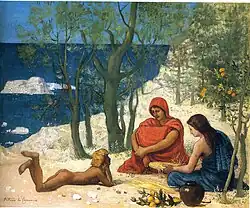 The motif of the princess choosing her future husband in a group of suitors during her wedding is found in other Indo-European myths, notably in the ancient Indian svayamvara tales and in Chares of Mytilene's "Stories about Alexander".[3][2] The background of the Phocaean version was probably influenced by the actual founding of the colony of Massalia around 600 BC by Greek settlers from the Ionian city of Phocaea, although earlier prototypes may have existed already in Phocaea.[4] The modern inhabitants of Marseille are still colloquially called the 'Phocaeans' (French: Phocéens).