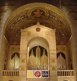 Among the artwork which pervades the entire church building are Byzantine-styled oil-painted effigies, murals, coffered walnut and mosaic ceilings, Mercer-tiled floors, Romanesque stone columns and arcades, numerous mosaics (including Raphael’s “Madonna of the Chair”, reproduced by Salviati of Venice), rare furniture artifacts, painted glass, and an Alden B. Dow-designed chapel. A memorial tower room situated between the narthex and the main lobby is dedicated to soldiers who lost their lives in World War I and features a mosaic and gold-leaf domed-ceiling which portrays four guardian angels symbolizing “Justice, Liberty, Peace and Fraternity.”