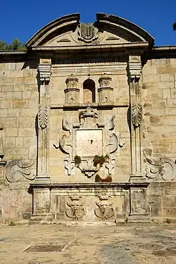 It consists of a central, high backrest with two pilasters supporting a cornice and frontispiece interrupted by royal coat of arms.[1] Between the fluted pilasters, is a lower cartouche with inscription, while the upper cartouche consists of two castles in high relief, one on either side of an edicule (where at one time there would have existed an image of the Virgin, in her invocation as Senhora dos Virtudes).[1] This combination of imagery taken together represents the coat-of-arms of the city of Oporto. On each side of this set is an acrobatic pyramid attached to their respective pilasters by a scroll.[1] The lower central part includes two frowning Renaissance faces from which are the water spouts.[1]