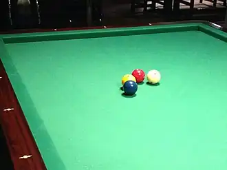 Four-ball billiards or four-ball carom (often abbreviated to simply four-ball, and sometimes spelled 4-ball or fourball) is a carom billiards game, played on a pocketless table with four billiard balls, usually two red and two white, one of the latter with a spot to distinguish it (in some sets, one of the white balls is yellow instead of spotted). Each player is assigned one of the white (or yellow) balls as a cue ball. A point is scored when a shooter's cue ball caroms on any two other balls in the same shot (with the opponent's cue ball serving as an object ball, along with the reds, for the shooter). Two points are scored when the shooter caroms on each of the three object balls in a single shot.[1] A carom on only one ball results in no points, and ends the shooter's inning.