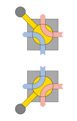 Because the two passages in the plug are somewhat L-shaped and do not interconnect, the four-way valve is sometimes called an × port.