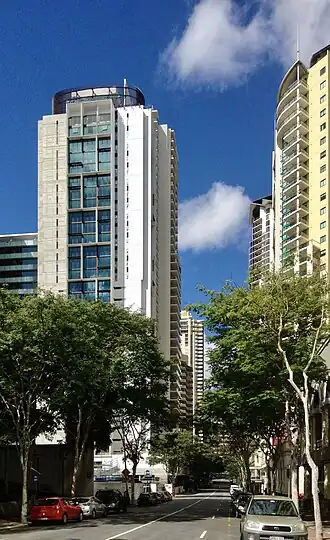 The 33-storey, 107-metre (351 ft) skyscraper is located in the heart of the Brisbane central business district adjacent to the Botanic Gardens and the Parliament House.