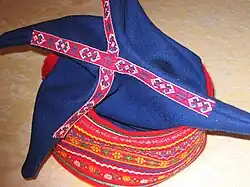 The Four Winds hat (Northern Sámi: čiehgahpir) is one version of traditional man's hat of the Sámi.[1] The basis is a simple blue cylinder, decorated with a band with braid patterns, but the top is a large, four-cornered star, colored bright blue with parts bright red and yellow. The decoration in an actual Sámi hat is, like the rest of the Sami garb, indicative of the person's place of origin or even his clan or marital status,[2] a little like the Scottish tartan.
