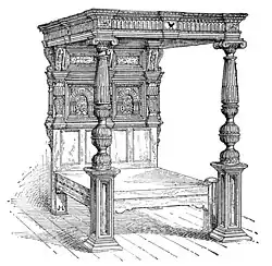A four-poster bed or tester bed[1] is a bed with four vertical columns, one in each corner, that support a tester, or upper (usually rectangular) panel or bedknobs. This tester or panel will often have rails to allow curtains to be pulled around the bed. There are a number of antique four-poster beds extant dating to the 16th century and earlier; many of these early beds are highly ornate and are made from oak.