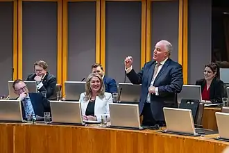 On 28 November 2024, it was reported by Nation.Cymru that Davies had been asked to step down by members of the Welsh Conservative group.[13] Later that same day it was reported that he would face a confidence vote in the Welsh Conservative group meeting on Tuesday 3 December.[14][15] He survived the confidence vote, reportedly with the support of 9 out of 16 members, including his own.[16][17] The vote was not held as a secret ballot, instead as a show of hands, after a motion by Davies and seconded by Laura Anne Jones.[18] Shortly after the vote, Davies resigned as leader of the Welsh Conservatives, stating he viewed his position as untenable, after a number of members of the Conservative Shadow Cabinet privately threatened to resign if he remained in post.[19][17][20] He formally left the role on 5 December 2024, after his replacement Darren Millar was elected unanimously within the Welsh Conservative group.[21][22]