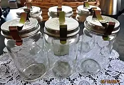 The Fowler's Vacola system uses glass jars, single use rubber ring seals and pressed metal lids, much like American Mason jars first patented in 1858, except that the jars and lids are not threaded. During the canning process, while still hot (and presumably sterile), the lids are secured by metal tension clips which are removed once cooled and a vacuum seal has formed.[4]