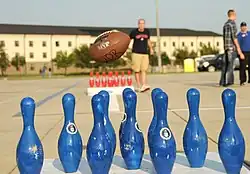 Fowling (/ˈfoʊlɪŋ/) is a hybrid game that combines the equipment of American football and bowling into one sport with a similar layout as horseshoes and cornhole. Most commonly played as a pastime in a tailgate or campground setting across the United States, Fowling was founded in 2001 by Chris Hutt and a bunch of friends from Detroit, Michigan, tailgating at the Indy 500.[1] The object of Fowling is for teams to be the first to knock down all opponent's pins by throwing a full-size regulation football at 10 bowling pins positioned in a traditional bowling layout.[1]