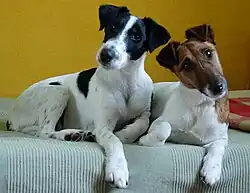 Both major types of Fox Terrier are mostly white with coloured markings and have similar facial characteristics.[12][13] They are essentially the same except for differences in coats, and slight differences in colouration and markings.[14] Markings on either type can appear black at birth on the head, but may lighten in adult life, the most common colours being tan and black.[15] The markings are a type of piebald spotting.[16] Although the two main breeds were originally commonly interbred, this no longer occurs in pure-bred lines.[17]