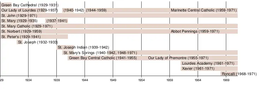 The Fox Valley Catholic Conference was formed in 1929 by seven parochial high schools within the Diocese of Green Bay: Cathedral in Green Bay, Our Lady of Lourdes in Marinette, St. John in Little Chute, St. Mary in Oshkosh, St. Mary Catholic in Neenah, St. Norbert in De Pere and St. Peter's in Oshkosh.[1] Cathedral spent two seasons in the conference before leaving in 1931 to compete as an independent.[2][3] St. Joseph of Marinette joined in 1932,[4] but they only lasted one season in the conference before leaving.[5] St. Mary left the Fox Valley Catholic Conference in 1935,[6] but returned two years later, offsetting the loss of Our Lady of Lourdes in 1937.[7] St. Joseph Indian School on the Menominee Indian reservation in Keshena joined the conference in 1939,[8] and Our Lady of Lourdes and newcomers St. Mary's Springs joined the Fox Valley Catholic Conference in 1940.[9] St. Mary's Springs was the only conference member not in the Green Bay diocese, as Fond du Lac County was part of the Archdiocese of Milwaukee. Green Bay Central Catholic joined the conference after opening in 1941,[10] the same year that the two Catholic high schools in Oshkosh (St. Mary and St. Peter's) closed their doors.[11][12]