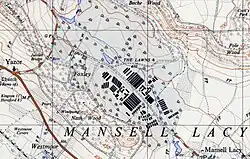 The estate is within a south-east to north-west aligned horseshoe valley (alternatively named Yarsop Valley), of 1,600 yards (1,500 m) long by 1,300 yards (1,200 m) wide, with its main entrance in Mansel Lacy. The valley bottom rises from approximately 340 feet (104 m) above mean sea level at the south-east, to 510 feet (155 m) at the Foxley Manor (remains of) north-west end. Through the estate flows a stream, interrupted by seven c.1800 or earlier man-made lakes and ponds, starting at Yarsop, entering the valley at the north, and with largely wooded margins, flowing at the north and parallel to the main valley road, past a 240 feet (73 m) by 100 feet (30 m) pond (SO4158946686), between the stream and the Foxley Manor site, then flowing at the north around the remains of the Camp, past the site of an old saw mill (SO4204546416), before passing out of the estate to lakes and ponds in Mansel Lacy village. The sides of the valley are wooded, at the south-west by Nash Wood which rises to 610 feet (190 m), and north-east by Bache Wood, rising to 790 feet (240 m). Through the valley bottom runs a road, the former processional way from the estate entrance at Mansel Lacy village, north-west to the country house and ancillary buildings of the Manor, and beyond to the estate border at a junction with the minor road running south from Yarsop at the north to the A480 road at St Mary the Virgin's church in Yazor. Opposite St Mary's (SO4066046538), is the 1887-built gatehoused north-west road to the rear of the previous Foxley Manor house, which also links to a network of woodland bridle paths within the south-west Nash Wood. From the valley road, chiefly running north-east, are access roads and tracks to remaining estate and residential buildings and, bordering both sides of the road (SO4185046420), are concrete stands indicating the position of wartime Foxley Camp structures. Between these and Bache Wood at the north is the area previously designated "The Lawns" (SO4203446660), now converted to coppicing and arable use.[1][2][3][5][6][7][8]