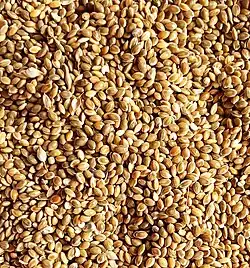 The small seeds, around 2 millimetres (3⁄32 in) in diameter, are encased in a thin, papery hull which is easily removed in threshing. Seed color varies greatly between varieties.