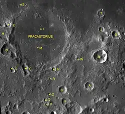 By convention these features are identified on lunar maps by placing the letter on the side of the crater midpoint that is closest to Fracastorius.
