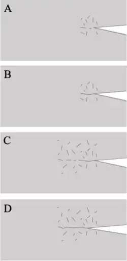 - Stage I: As the sample is loaded, the frontal process zone forms which is a zone of micro cracks ahead of the main crack tip. The crack accelerates through this zone until the crack tip is ahead of the formed microcracks. Crack propagation slows when the crack tip is ahead of the microcrack zone, where the region of microcracks exert a compressive stress on the crack tip.[4]
