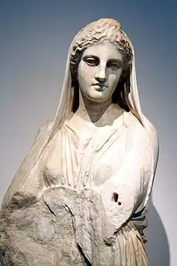 It is not clear how large the complete relief was or how many other people were depicted in it. It probably belonged to one of the most elaborate grave monuments of the fourth century BC, some of which are known today. Such monuments were mostly erected by the economically successful members of the Athenian citizenry. The nose, part of the lips and the greater part of the cloak are entirely modern reconstruction, carried out in the workshop of Johann Gottfried Schadow.