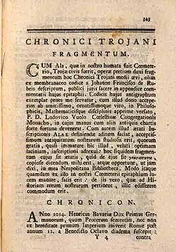 There is no surviving manuscript of the Chronicle. It survives only in printed form.[1] This shows numerous copying errors and other signs of a complicated transmission and possible editing.[2] The earliest copy is the edition included by Alessio Aurelio Pelliccia in his De Christianae Ecclesiae primae, mediae et novissimae aetatis Politia, printed in 1779 and again in 1782. This edition was based on a parchment codex copied by Giovanni Francesco Rossi in the 16th century and given to Pelliccia by his friend Lodovico Vuolo along with a trove of old documents. Rossi was also the source of the only known manuscript copy of the Annales of Lupus Protospatharius, also now lost.[1] According to Pelliccia, the Chronicle was a mere "fragment" in the copy he received. The title he gave it, Chronici Trojani fragmentum, means "fragment of a Troian chronicle". The text as it stands is incomplete and disorganized.[3]
