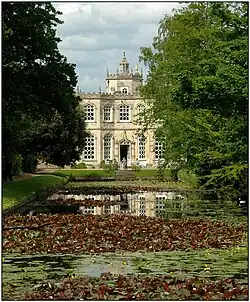 Earlier gardens were replaced around 1806 from which the walled garden and yew hedges survive.[24] The earlier garden included a parterre and kitchen garden.[17] The current park is approximately 400 metres (1,300 ft) by 300 metres (980 ft) and is mostly grass with trees.[25] South east of the house are lakes which were developed from earlier gravel pits.[17] Surrounding the grounds are stone walls with ornate symmetrical gates and gatepiers.[26][27]
