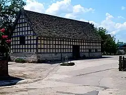 Manor Farm was built, on the site of an earlier house, in the 15th century and added to in subsequent centuries. It has a courtyard plan with the service wings forming a "U" shape around the courtyard. The timber framing of the building is visible from inside and outside. The interior contains several stone fireplaces, one of which may have been brought into the house from elsewhere.[22] The attached barn may have originally been built as a wool store. The timber-framed building was constructed in the 15th century. The seven bay barn has a flagstone floor and an arch braced roof.[23]