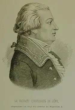 In 1811, he was created a Baron d'Empire and given an estate in Westphalia.[5] Napoleon made him Commander-in-Chief of the Armies of the former Kingdom of Holland and he was given a division in Austria that formed part of the army that fought at the Battle of Austerlitz. He was made a Grand Officer of the Legion of Honour as Commandant du Génie in Italy and Spain in 1813. In 1818, on the restoration of Louis XVIII of France, Chaussegros de Léry was created Vicomte de Léry and given the Grand Cross of the Legion of Honour.[6]