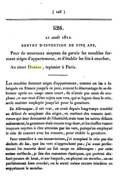 Darrac was also an inventor. In August 1812, he was granted a patent (Brevet d'invention) for five years[2] for his new methods for upholstering furniture and his new method of producing a bed base.