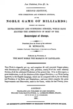 - ^ [2] Google Books. The Noble Game of Billiards, Wherein are Demonstrated Extraordinary and Surprising Strokes Which Have Excited the Admiration of Most of the Sovereigns of Europe (Mingaud, John Thurston). Retrieved 3 June 2015.