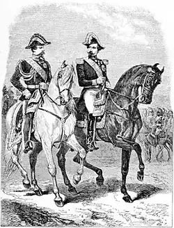 France played a central role as Emperor Napoleon III sponsored the unification of Italy in the 1850s, and then blocked it by protecting the papal states in the 1860s.[6] Napoleon had long been an admirer of Italy and wanted to see it unified, although that might create a rival power. He plotted with Cavour of the Italian kingdom of Piedmont to expel Austria and set up an Italian confederation of four new states headed by the pope. Events in 1859 ran out of Napoleon's control in the Second Italian War of Independence. Austria was quickly defeated, but instead of four new states, a popular uprising and a new sense of Italian nationalism united all of Italy under Piedmont. The pope held onto Rome only because Napoleon sent troops to protect him. France's reward was the County of Nice (which included the city of Nice and the rugged Alpine territory to its north and east) and the Duchy of Savoy. Piedmont, known officially as the Kingdom of Sardinia, worked closely with France to unify Italy—militarily by pushing Austria out, and financially by providing over one billion gold francs in 1848–1860, which was half the money Sardinia needed. Cavour used the Rothschild Bank in Paris extensively, but also plated off against British and other European financiers.[7] He angered French and Italian Catholics when the pope lost most of his domains. Napoleon then reversed himself and angered both the anticlerical liberals in France and his erstwhile Italian allies when he protected the pope in Rome. When war with Prussia loomed in 1870, France withdrew its armies and the new Italian government absorbed the papal states and Rome.[8]